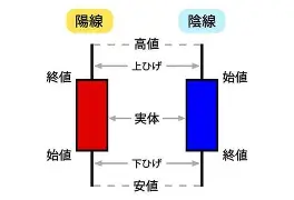 | 陰線(いんせん) | 青または黒 | 売り方が優勢(勝った)。 | 始値より終値が安い。 |