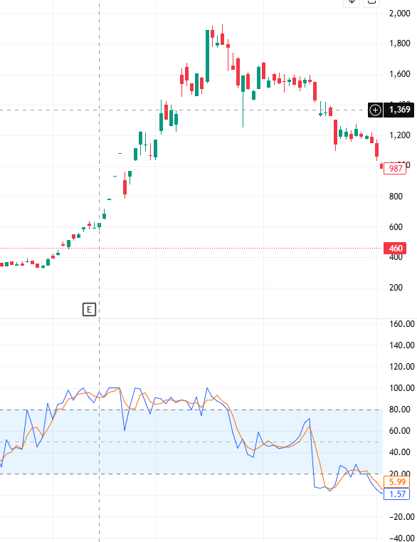 買われすぎ水準(80%以上)にあるとき、%DがSlow %Dを上から下に突き抜ける現象。 → 強い反落(売り)のサインとして利用されます。
