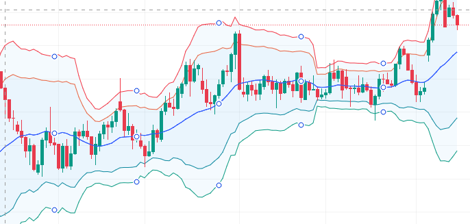 ボリンジャーバンドは、移動平均線(MA)の上下に、株価の標準偏差(統計学におけるデータのばらつき度合い)から計算されたラインを複数本表示したものです。
